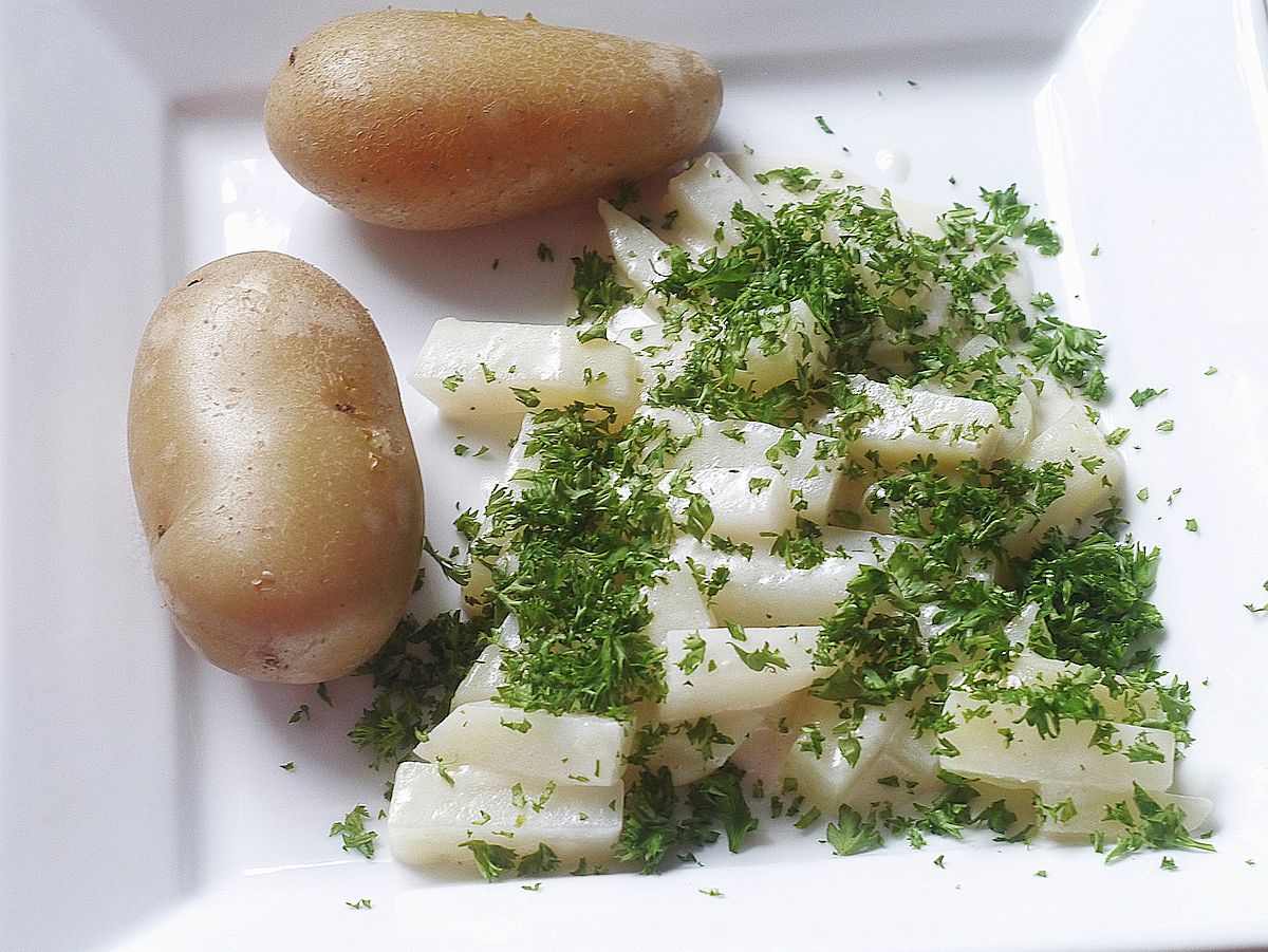 Kohlrabi und Pellkartoffeln – Extra-Sauce ist nicht im Bild, war aber vorhanden: Eine Bechamel-Sauce mit Kokosnussmilch und einem milden Camembert.