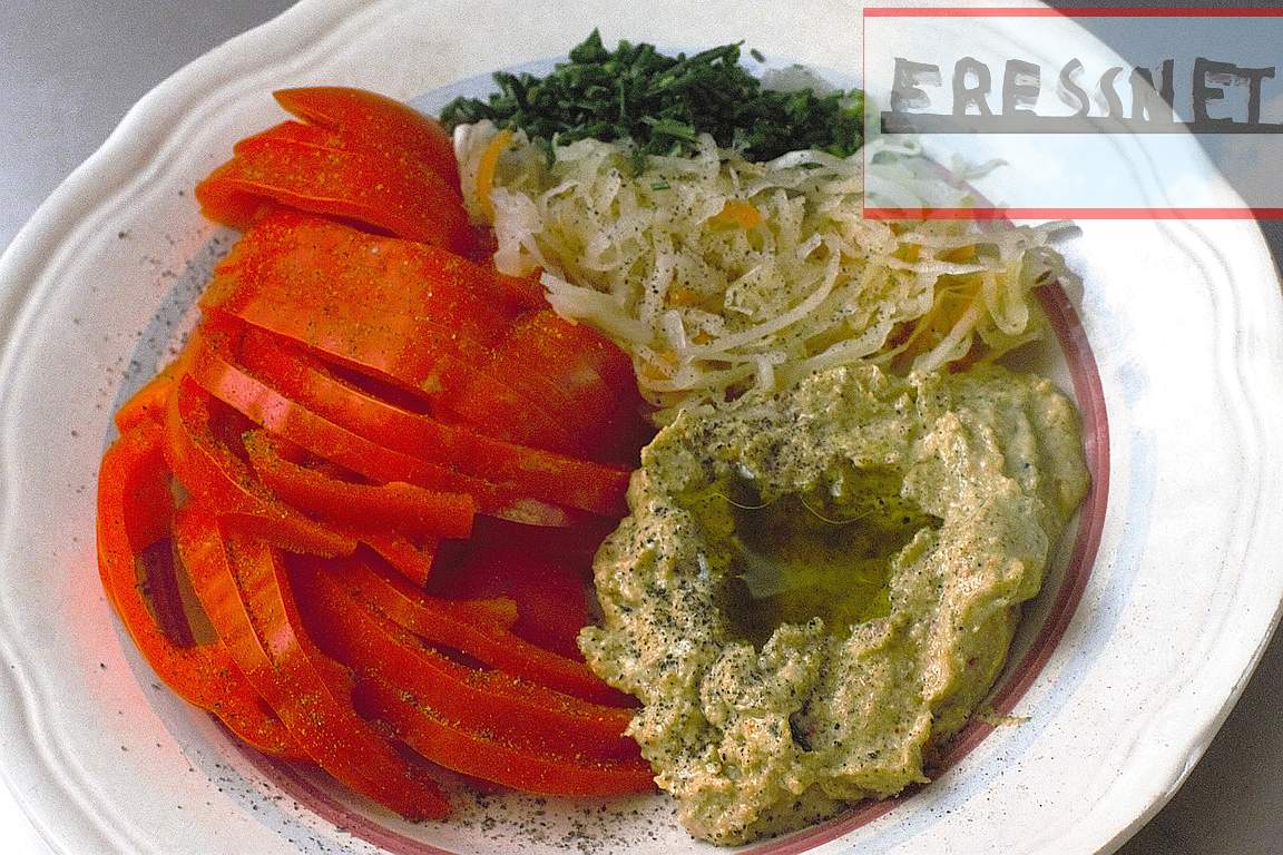 Langzeit-Sättigung: Paprika, Hanfsamen-Hummus, frisches Sauerkraut mit Schnittlauch