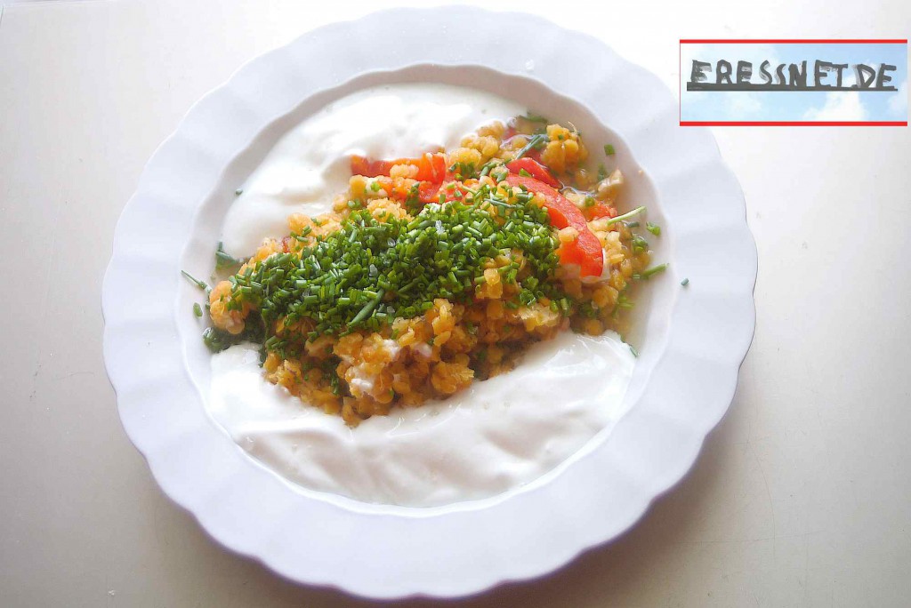 Hier wurden die Linsen in Gemüsebrühe gegart, zum Ende dieses Vorgangs kamen geschnittene Paprika, gewürfelter Feta, Koblauch und reichlich geriebener Ingwer hinzu. Weil sich das so anbot, habe ich am Tellerrand noch 3 EL Zitronen-aromatisierten milden Essig und ein paar EL Ziegenmilch-Yoghurt angefügt, nebst einem kleinen Bund in Röllchen geschnittenen Schnittlauch.