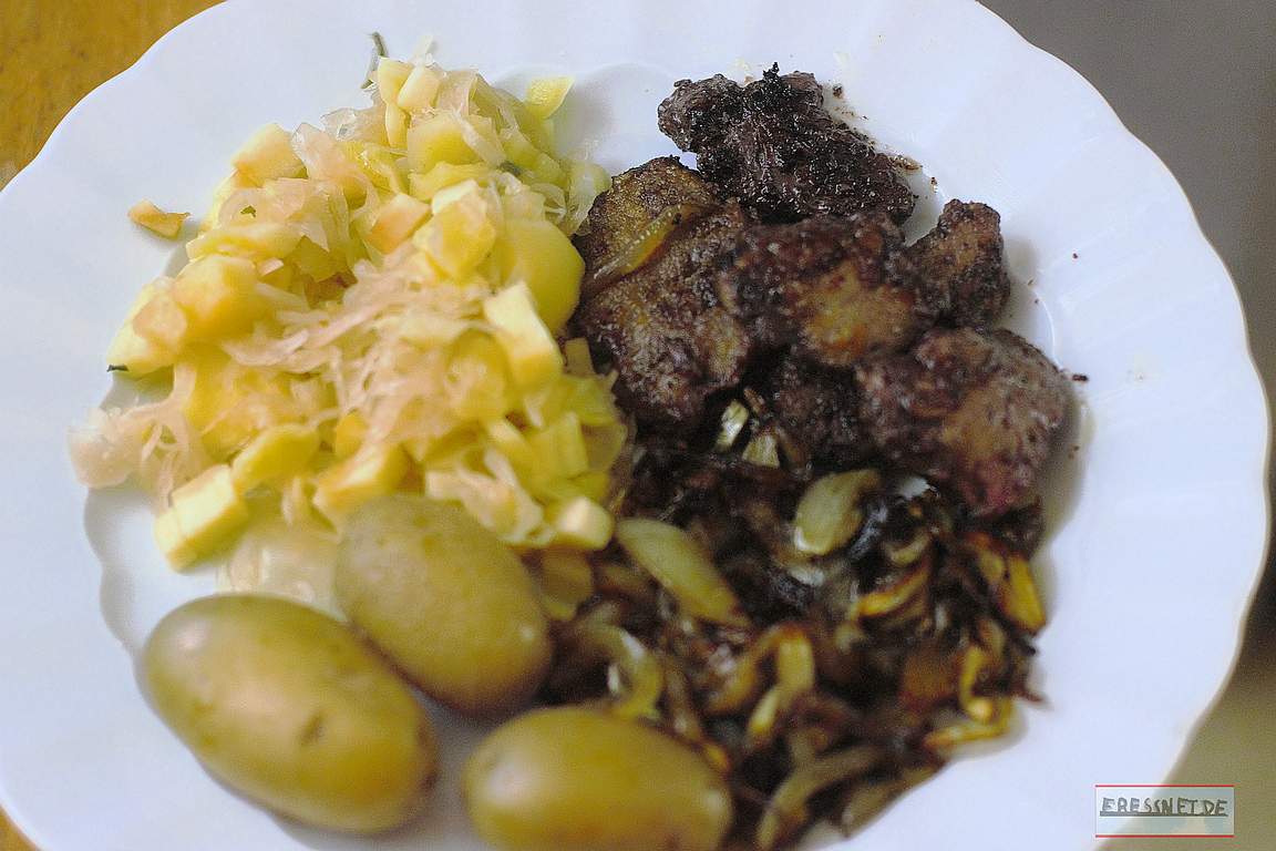 Auf diesem Teller präsentiert sich gebratene Geflügelleber, sozusagen im Rahmen der „funktionellen Ernährung“, denn Leber führt dem Essenden Eisen zu, bewahrt ihn also hoffentlich vor einer Anämie. Oder ist das auch nur so ein Mythos?